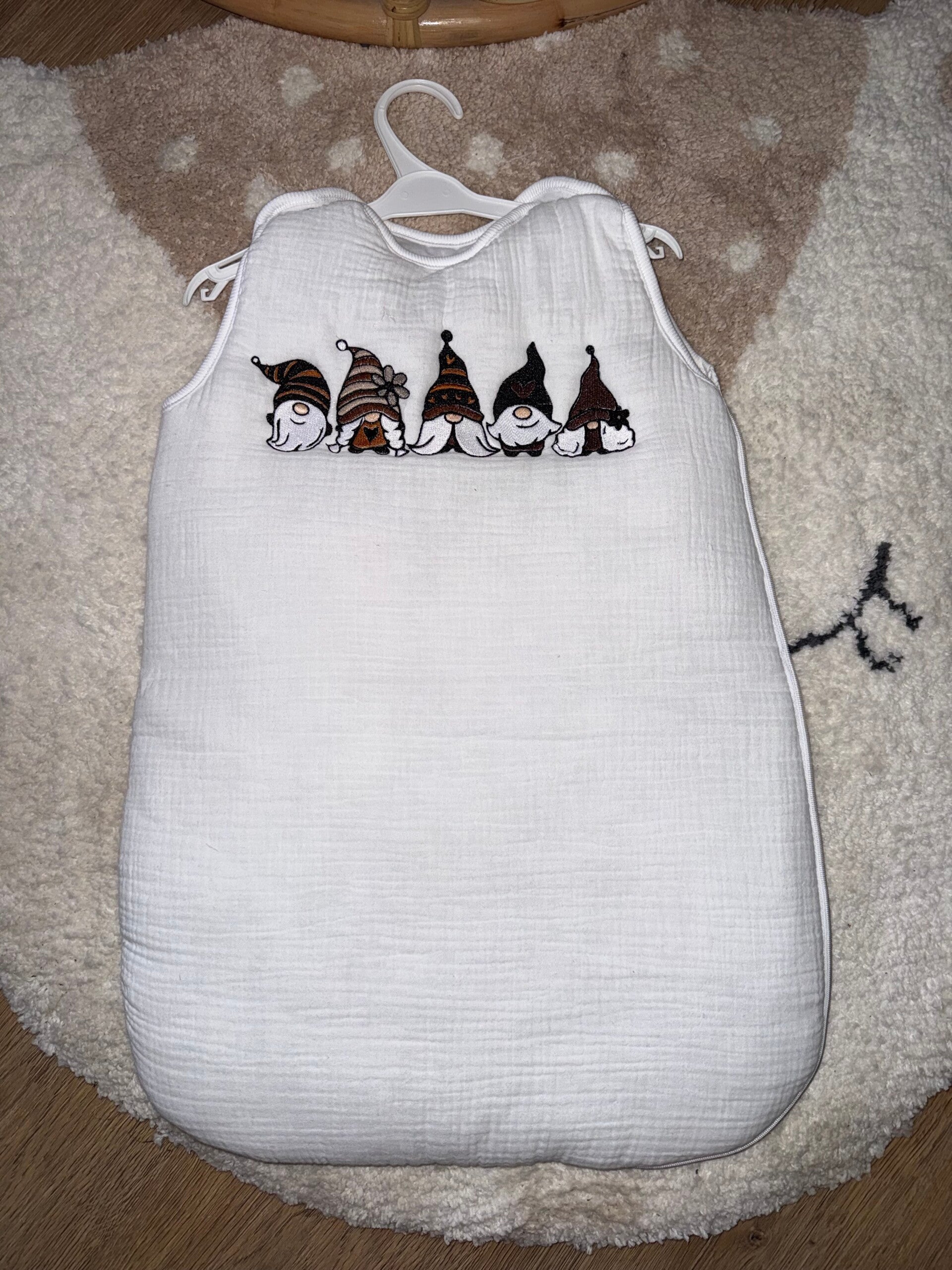 Une gigoteuse pleine de tendresse, décorée de plusieurs petits lutins brodés pour veiller sur les nuits paisibles de bébé.